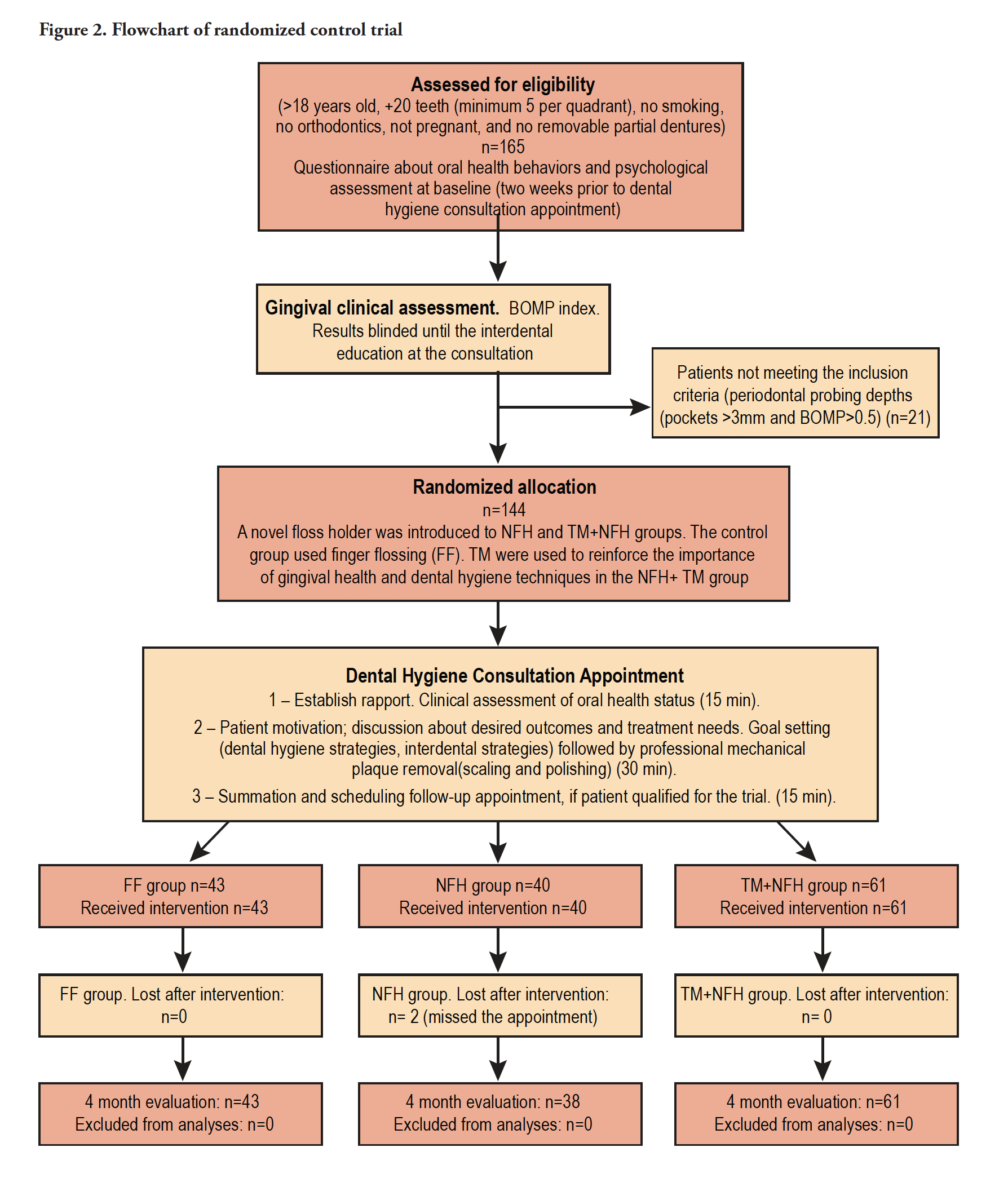 Several limitations should be considered in the interpretation of the study findings. Although all participants used floss less often than the daily frequency recommended, participants were generally motivated towards oral hygiene behaviors, as inferred by high levels of intention at baseline. This is not surprising, considering that all participants had gingivitis and had been invited to have it treated at no cost. Therefore, the results can only be generalized to similarly motivated individuals with low levels of floss usage. In order to better understand the motivational contribution of a NFH, a group combining the use of FF with TMs will be important to include in future studies. Future studies should also consider the comparison of floss holder devices vs another type of interdental cleaning aid such as interdental brushes, water flossers, and wood sticks. In spite of its limitations, this study had several strengths. The study included the objective BOMP clinical measures as well as self-reported measures. Second, the dental hygiene consultation appointment was designed to include important behavior change techniques for all groups, representing an important addition to the routine care included in these appointments. Third, was the inclusion of a follow-up at four months, a shorter interval than normally used.4,20Future studies should look at the maintenance of these behaviors and gingival health status over longer periods of time.