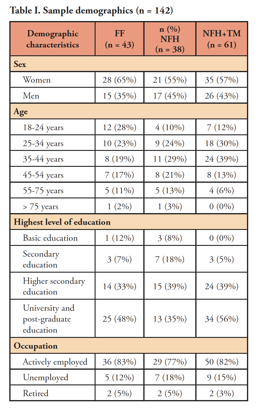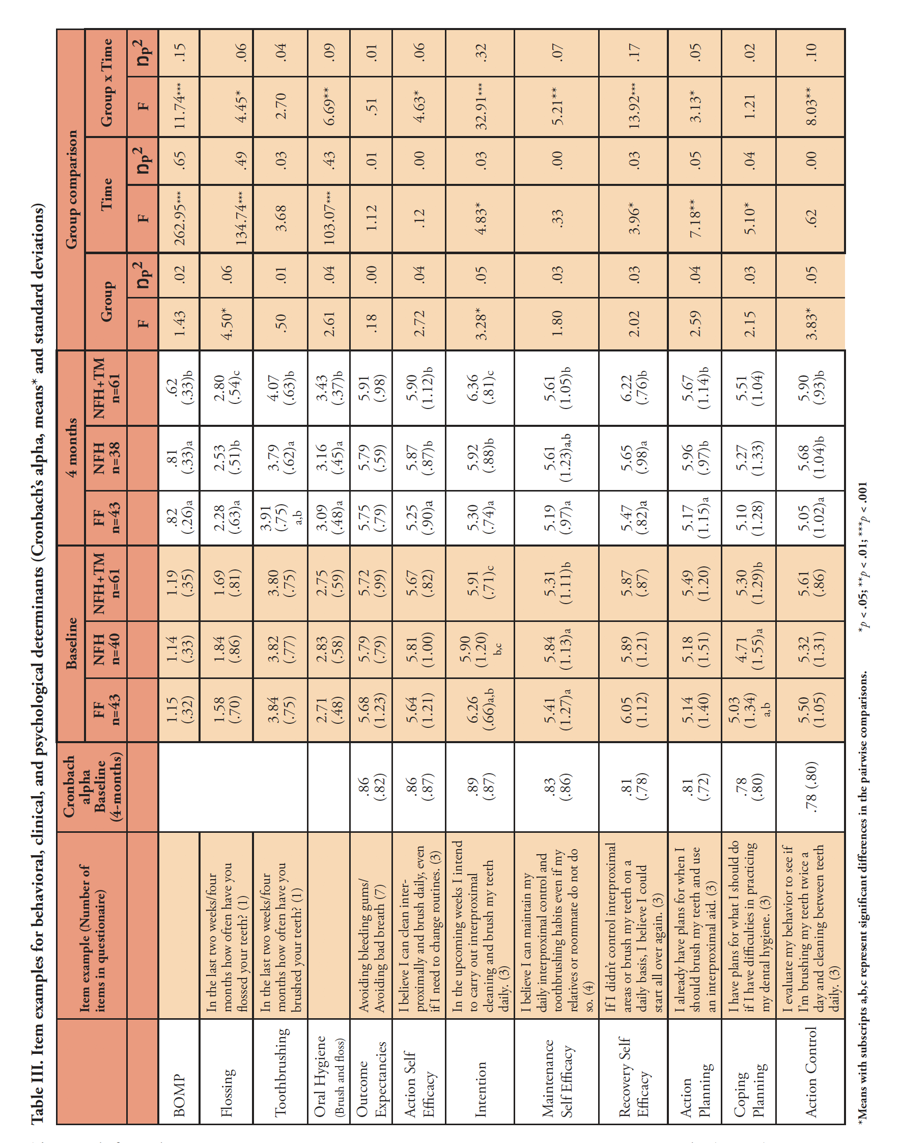 A dropout analysis and a randomization check was performed through multivariate analysis of variance (MANOVA) for the psychological determinants, behavior, and clinical gingival outcome; ANOVA and Chi-square tests were used to compare continuous and categorical variables, respectively. Distribution normality (Shapiro-Wilk) and variance homogeneity (Levene's test) were verified for all outcome variables. To compare the three groups at the four-month follow-up, mixed between/within-subject repeated measures ANOVA with each intervention group (FF, NFH, NFH+TM) times the assessment time (baseline vs. four months) were computed. Whenever differences of interest were found at baseline in outcome variables, the same analysis was repeated introducing baseline scores as a covariate.