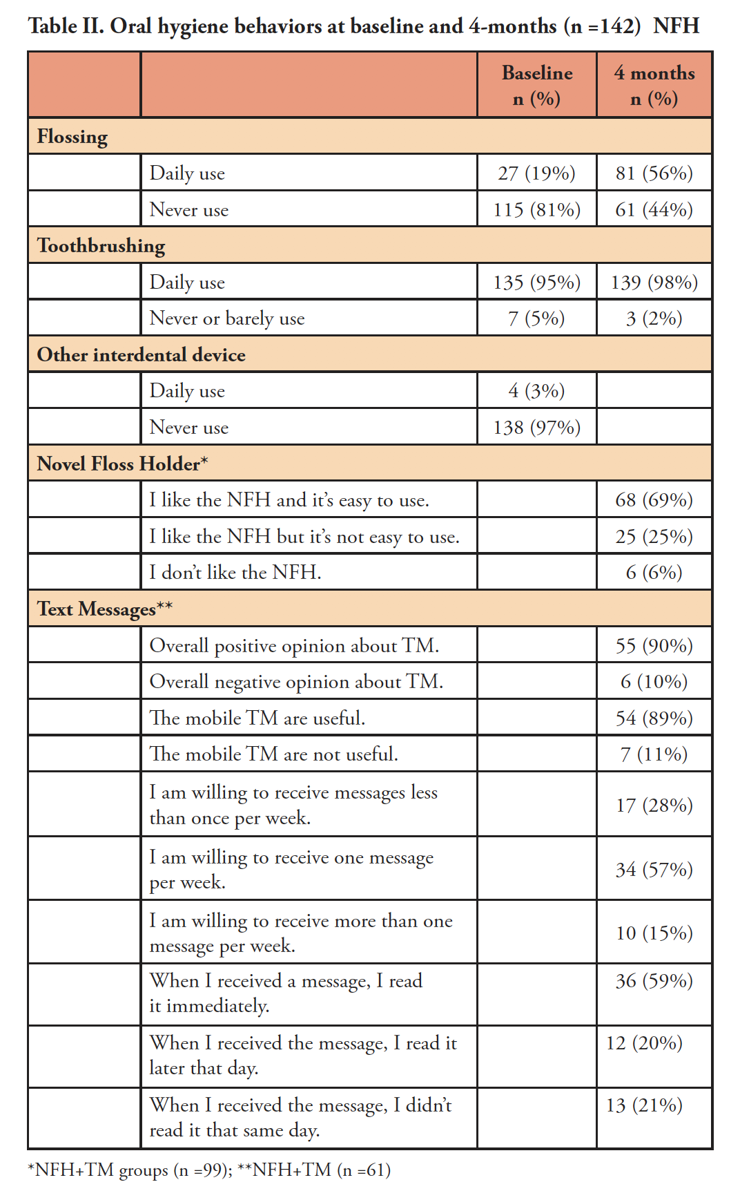 Descriptive demographic data for the sample are presented in Table I. Participants' daily frequency of flossing was low at baseline (M=1,7, SD=.79); the majority either never or barely used dental floss. Reference to other interdental devices for dental plaque control was low, with only 2.8% of individuals using interdental brushes. However, the majority of the sample brushed their teeth twice a day. The initial level of BOMP for the entire sample was relatively high, with an average of 60% bleeding points. The majority of the NFH+TM sample considered the messages useful for the new behavior and rated the TM very positively overall in regards to comprehensibility, interest, and relevance. Regarding the use of the NFH, 69% liked it after four months of usage, although around a third of participants reported some difficulties in using it. Oral hygiene behaviors at baseline and 4-months are shown in Table II.