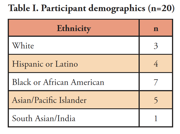 Two male and 18 female parents ranging in age from 22 to 49 years agreed to participate. Participants had children ranging in age from 18 months to 20 years and each participant had at least one child enrolled in a Title 1 NYC public elementary school. On the average, each household in the study had two children; however, two households had up to eight children. Participants were from low socio-economic backgrounds and resided in low-income neighborhoods. The sample population was representative of the high-risk demographic for children with oral health disparities. Complete demographic data is shown in Table I.