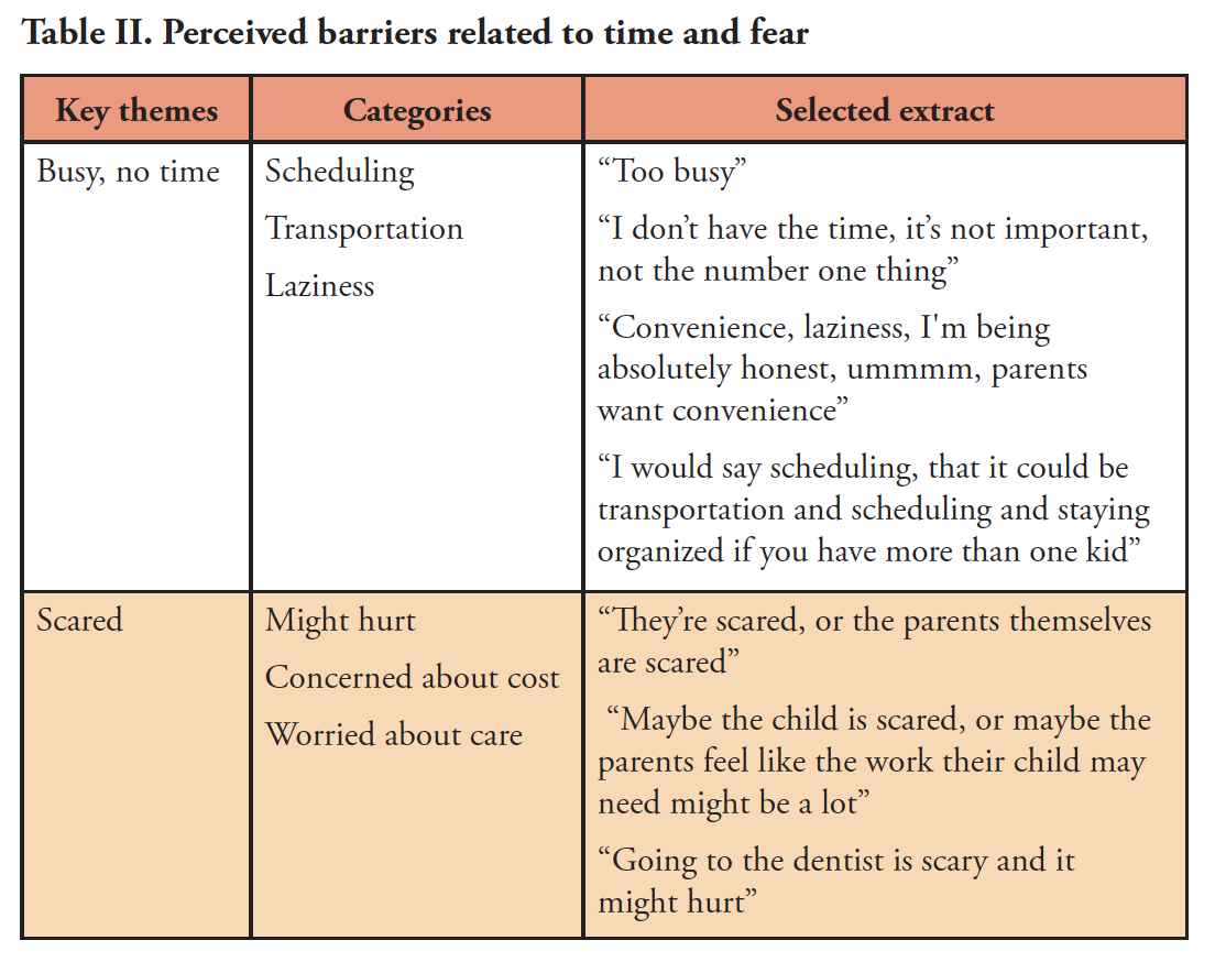 The first theme, "too busy," captured how participants described potential reasons including transportation, scheduling and laziness for not escorting their children to preventive oral health programs. Theme two was "scared or fear" which reflected how participants described their own feelings regarding going to the dentist or how they thought their children would react (Table II).
