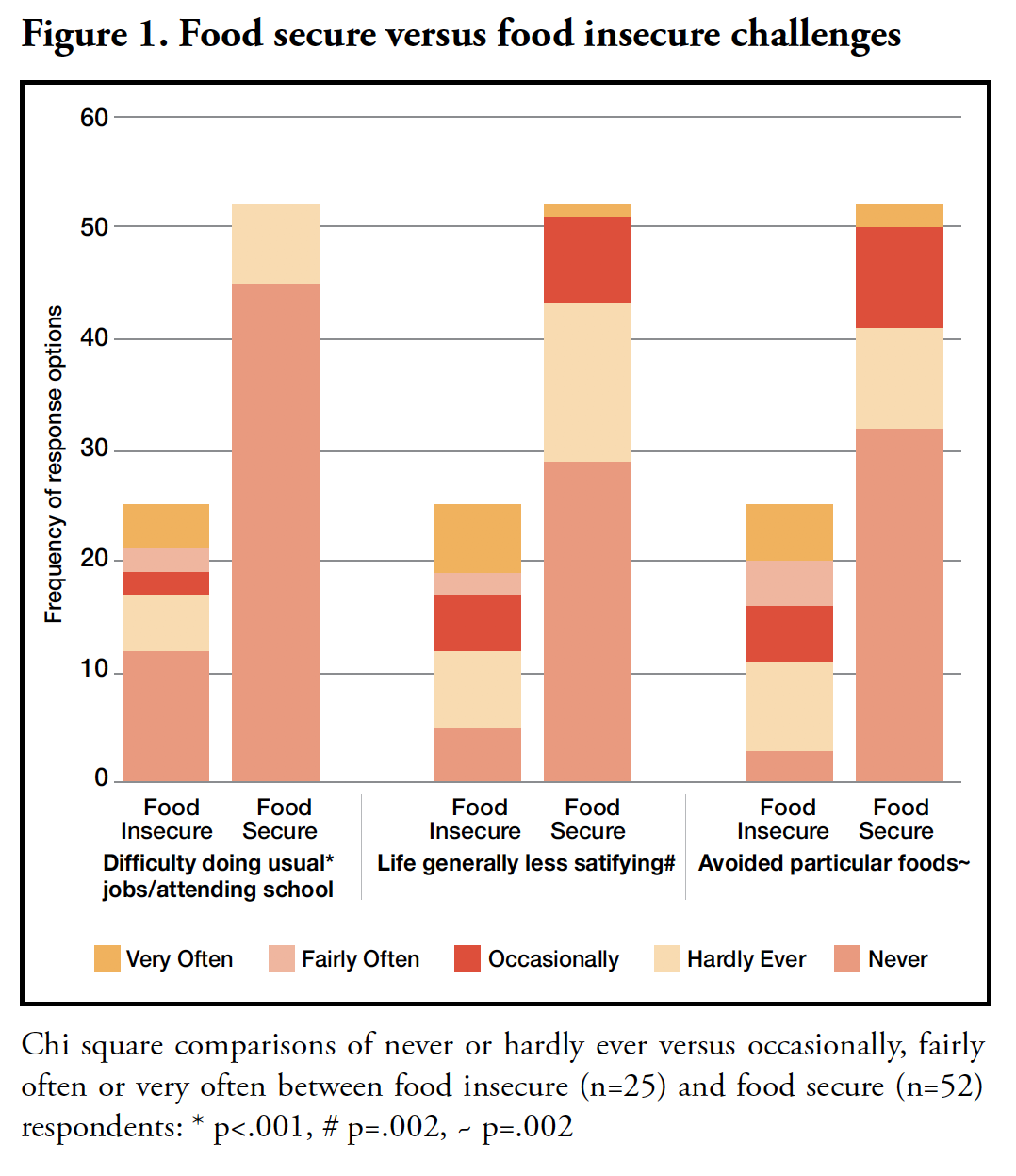 Food insecurity was associated with having more oral health concerns. The greater the score indicating food insecurity, the more frequently problems related to teeth, mouth, or dentures impacted being able to perform a job or attend school (r=.47, p<.001, n=77), needing to avoid specific foods (r=.45, p<.001, n=77), and overall satisfaction with life in general (r=.49, p<.001, n=77). Comparing categories of food security and oral health impact affirmed these findings. Food insecure respondents, compared to being food secure, were significantly more likely to report occasionally, fairly, or very often (compared to never or hardly ever) that problems with their teeth, mouth, or dentures led to difficulty doing a job or attending school, affected daily life practices, and led them to avoid particular foods (Figure 1). In addition, food insecure respondents were less likely than food secure respondents to indicate that they had no oral health problems in the previous six months (16% vs. 54%; p=.003).
