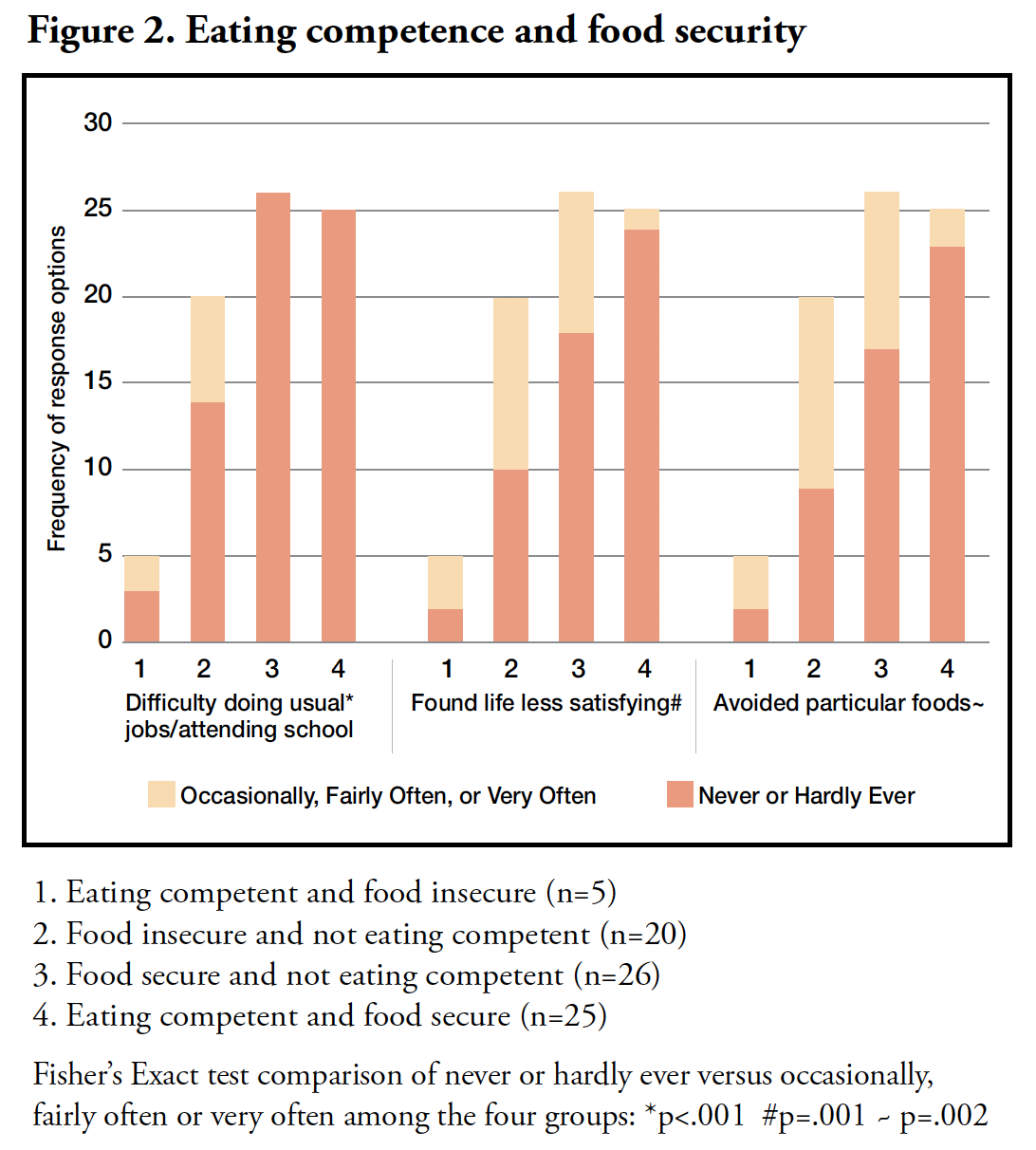 Eating competence was associated with indicators of oral health. For example, cavities were noted as the reason for a dentist visit by more non-eating competent than eating competent respondents (51% vs 21%, p=.004). Only 13% of eating competent respondents reported life to be less satisfying in general because of teeth, mouth, or denture problems, compared to 43% of those not eating competent (p=.002). Eating competent respondents were less likely to avoid particular foods because of oral problems (18% vs 45% not eating competent; p=.006). These relationships remained significant when analyzed with a GLM controlling for low-income (p=.008 and .006, respectively). However, when analyzed using a GLM controlling for food security, responses about these oral health impacts did not differ by eating competence status. The relationship with food security is shown in Figure 2. Of the 26 participants who were not eating competent, but food secure, none reported that their oral health occasionally, fairly or very often made doing their job or attending school difficult, whereas this level of dissatisfaction with their oral health was noted by 30% of the 20 who were not eating competent, but also not food secure. In addition, ecSI 2.0™ scores were inversely correlated with frequency of avoiding foods for oral health reasons (r=-.25, p=.018, n=92), but this correlation did not remain significant after controlling for food security score.