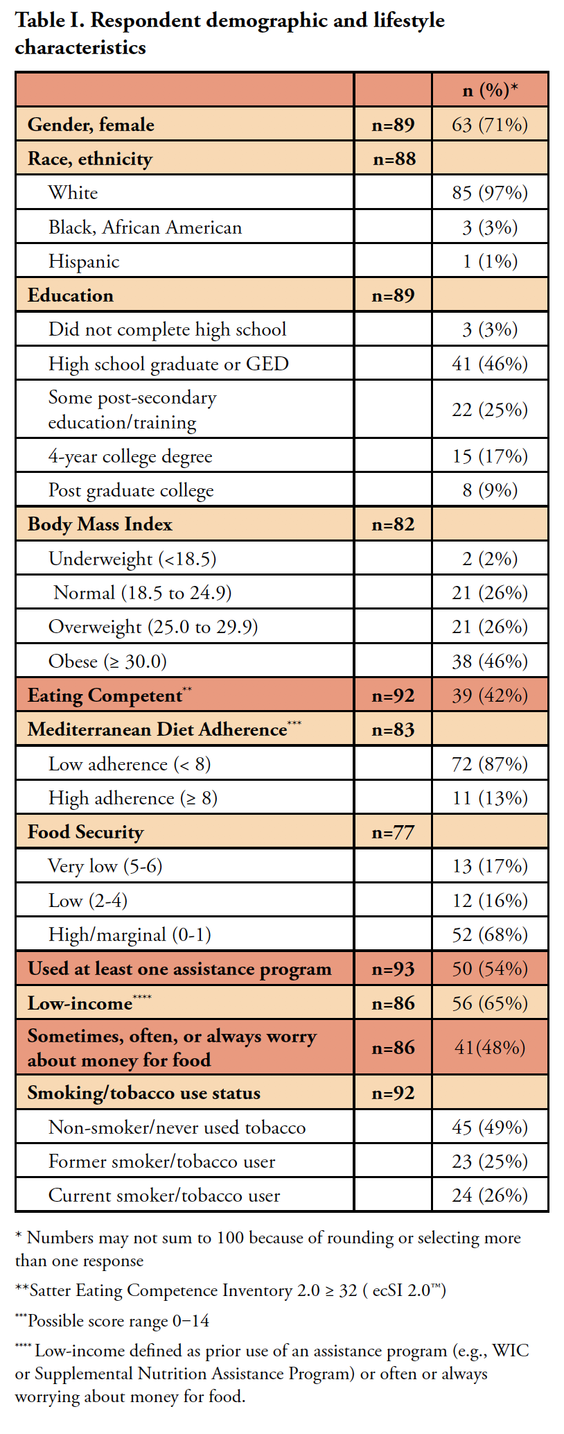 The study link was accessed by 96 respondents; 93 respondents agreed to participate. They were from eight central Pennsylvania counties and were primarily white, females with a mean age of 41.2 ± 12.3 years (ranging from 18 to 71) who attended free clinics or a community clinic in Pennsylvania. With the exception of the Internal Regulation subscale items, the ecSI 2.0™ was incomplete for one respondent, which resulted in a sample size of 92 for total ecSI 2.0™ and three subscales. The Mediterranean Diet, Food Security scale, ecSI 2.0™ and subscale scores were all normally distributed. Internal consistency was demonstrated for the food security scale and ecSI 2.0™ with Cronbach alphas of 0.843 and 0.927, respectively. Few had eating practices that adhered to a Mediterranean diet plan and less than half were eating competent. The mean ecSI 2.0™ score was 29.4 ± 9.9, range from 2-48. The ecSI 2.0™ mean subscale scores were: Eating Attitudes 10.3 ± 3.4, range 1-15; Food Acceptance 4.3 ± 2.4, range 0-9; Internal Regulation 6.2 ± 2.2, range 0-9; and Contextual Skills 8.6 ± 3.8, range 0-15. Mean Mediterranean diet score was 4.7 ± 2.2 with a range of 0-10. The Mediterranean diet score or adherence categories were not associated with ecSI 2.0™ score or being eating competent. However, adherence to the Mediterranean diet was positively correlated with the food acceptance (r=.23, p=.035, n=82) subscale score.