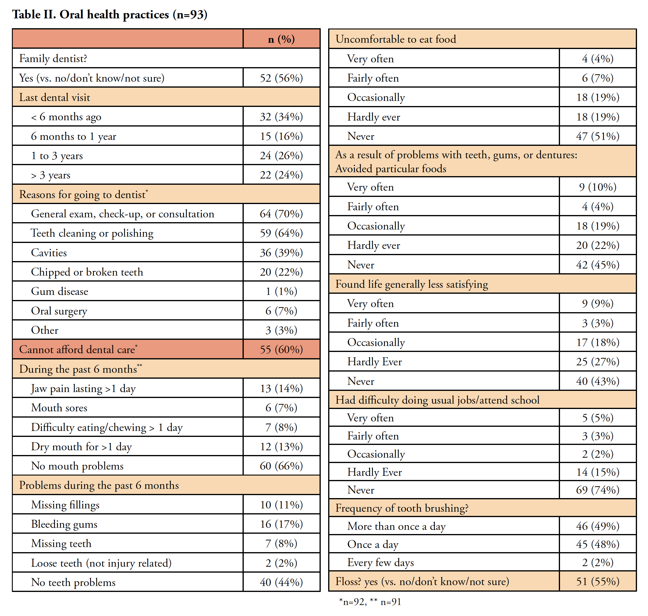Approximately 21% (n=19) were afraid of the dentist. Nearly two thirds (64%; n=59) did not have dental insurance. Dental care was not affordable for 60% (n=55). Oral health practices of respondents are shown in Table II. When asked if life was less satisfying in general because of teeth, mouth, or denture problems, 28 (30%) replied occasionally, fairly or very often, with 8 (9%) denoting very often. Difficulty with jobs or school attendance was attributed to problems with teeth, mouth, or dentures by 10 (11%) respondents. Almost one-third avoided particular foods because of problems with their teeth, mouth, or dentures.