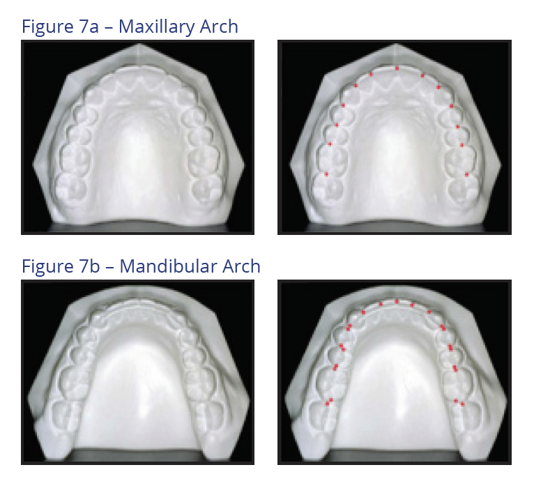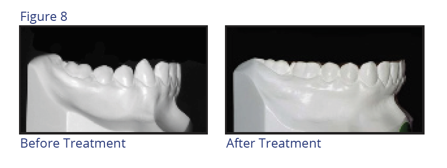 The depth of the curve of Spee should be fairly flat ranging from 0.5 mm to 1.5 mm at its deepest point. An average curve of Spee is 1 mm. Figure 8 illustrates curves of Spee before and after treatment.