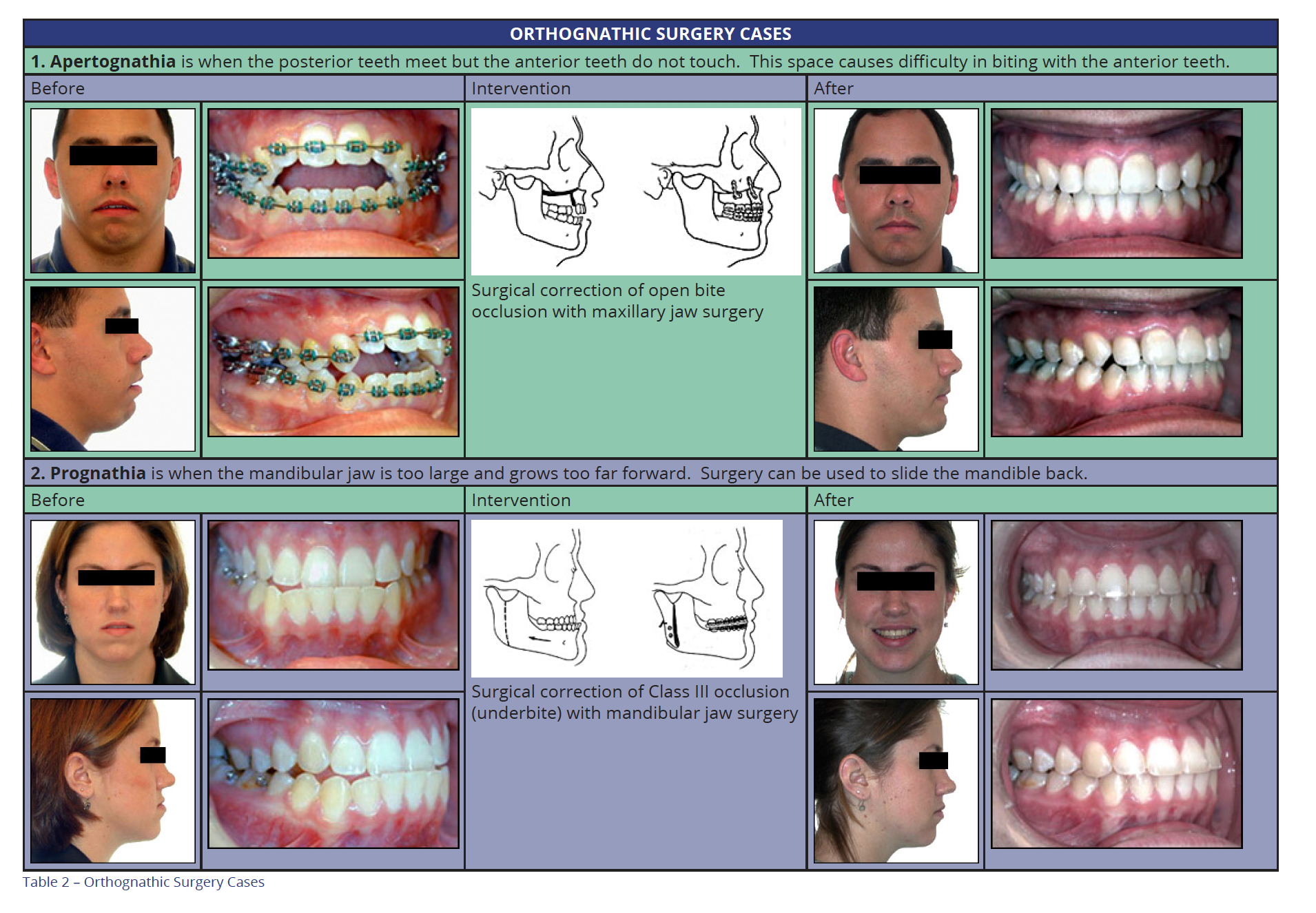 Table 2 illustrates situations that lend themselves to orthognathic surgery.