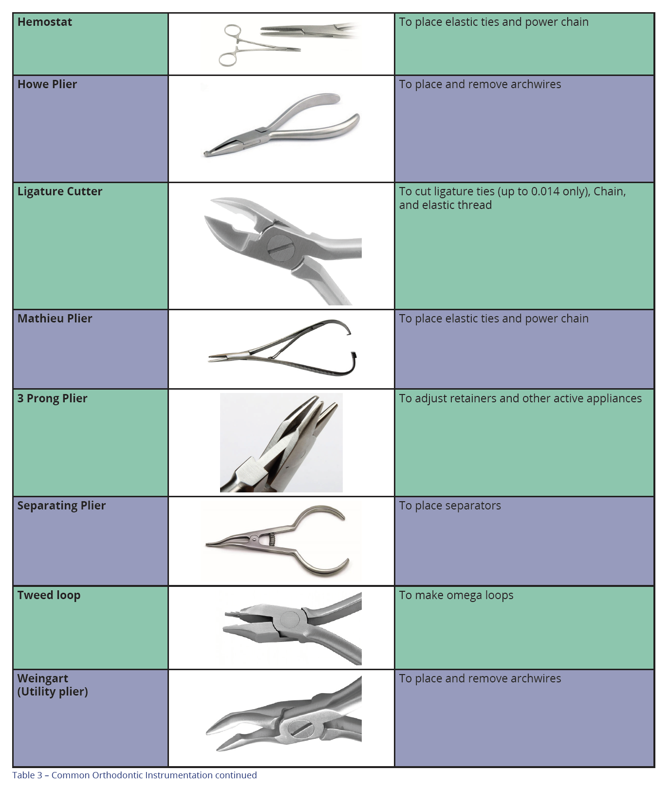 As with any dental specialty, orthodontics has a series of instruments that makes delivery easier. Table 3 describes common orthodontic instrumentation.