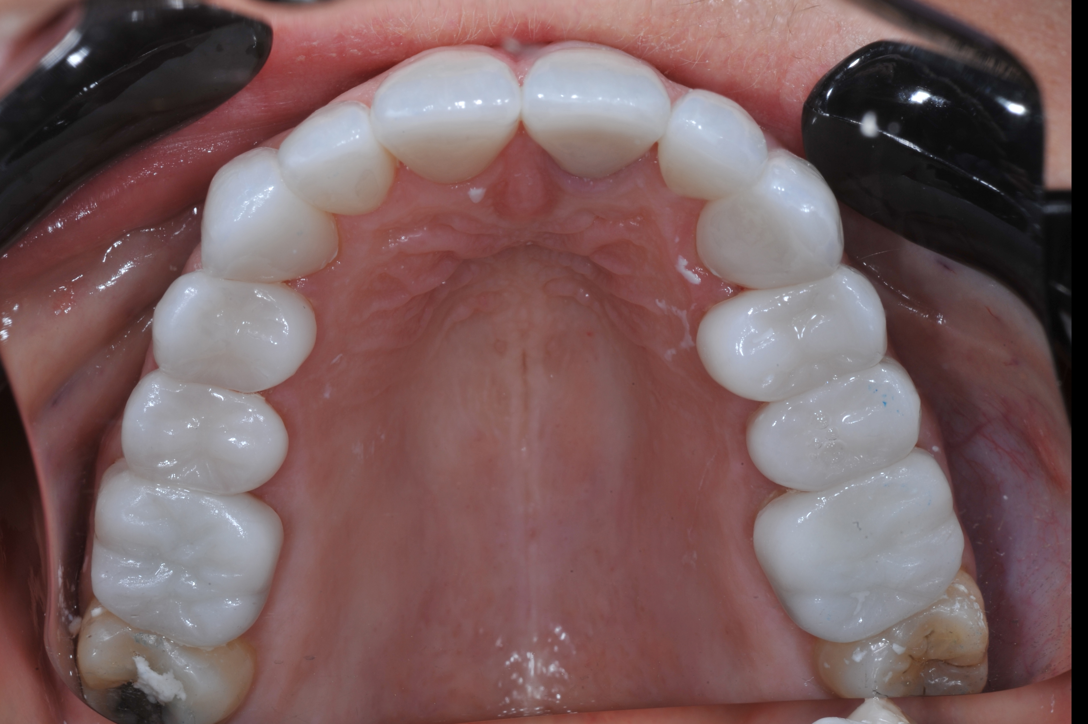 Impressions were taken with a poly vinyl siloxane (Panasil, Kettenbach) and sent to the laboratory with all photos, bite registrations, and dentofacial analyzer index (Kois Dentofacial Analyzer, Panodent). Temporaries were made for the central incisors, 2% chlorhexidine painted on teeth (Cavity Cleanser, Bisco) and placed with a temporary cement (Zone Free, Pentron). The instructions for the laboratory were for monolithic zirconia restorations Nos. 3 to 14, with particular attention to occlusion, opacity, value, and final shade.