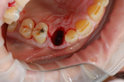 Figure 1 and Figure 2 depict the preoperative image and subsequent removal of three posterior teeth, immediate placement of zirconia-oxide ceramic dental implants, and soft-tissue augmentation with platelet-rich fibrin (PRF) to enhance the soft-tissue architecture surrounding the ceramic implants. The teeth were removed atraumatically and without suture placement. Because the implants were one-piece in stature (the abutment was incorporated into the implant), the recommendation was to splint the multiple units to minimize the lateral forces from mastication, swallowing, and tongue movement.