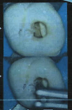 Fig 2. In this tooth, the chamber is widened to remove obstructions for better canal visibility. (A) The chamber floor is widened with the round bur, and (B) the diamond shaper rests on the chamber floor.