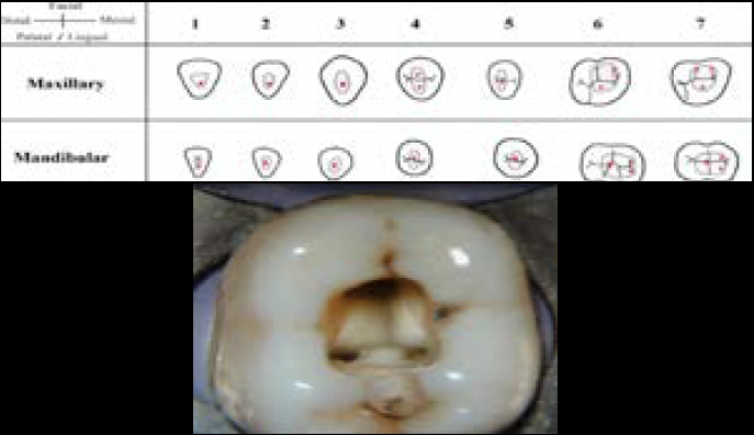 Fig 3. Top: Diagram of canal locations and shapes of access openings in maxillary and mandibular molars. Bottom: The photograph displays a mandibular first molar with a distal canal and two mesial canals.