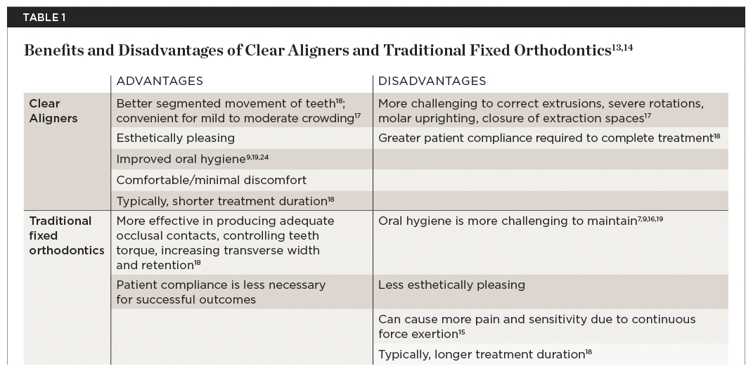 Because of its clear thermoplastic material, clear aligners are not easily noticeable and are more esthetically pleasing than fixed orthodontic appliances, and are therefore preferred by many patients7 (Table 1).