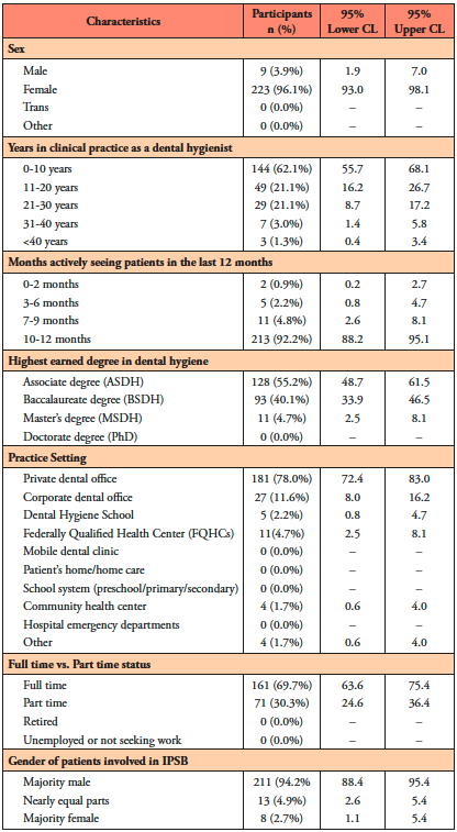 A total of 471 participants began the survey, with 232 finishing it, for a 49% completion rate (n=232). Demographic data for the participants revealed the majority of participants were female (96.1%, n=223) and the median number of years in clinical practice was 7, with the majority (91.8%, n=213) continuously treating patients over the past 12 months. Over one half of the participants (55.2%, n=128) held an associate degree and over three quarters of the participants provided clinical care in the private practice setting (78%, n=121). Sample demographic information is shown in Table I.