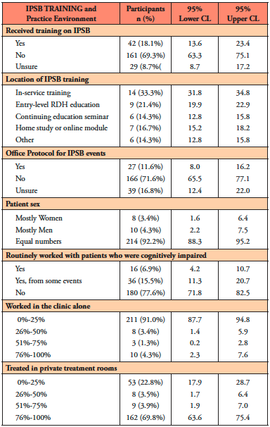 Responses regarding IPSB training and clinical practice environments revealed that a majority of participants worked in private (closed) treatment rooms (69.8%, n=162) and that most participants (77.6%, n=180) did not work with patients identified as cognitively impaired. Most of the participants had not received training on IPSB (69.3%, n=161) nor had employers who had developed an office protocol on the management of IPSB events (71.6%, n=166). Of the respondents who had received training (n=42), in-service sessions were the most common source of training (33.3%, n=14). Descriptions of IPSB training sessions and practice settings are shown in Table II.