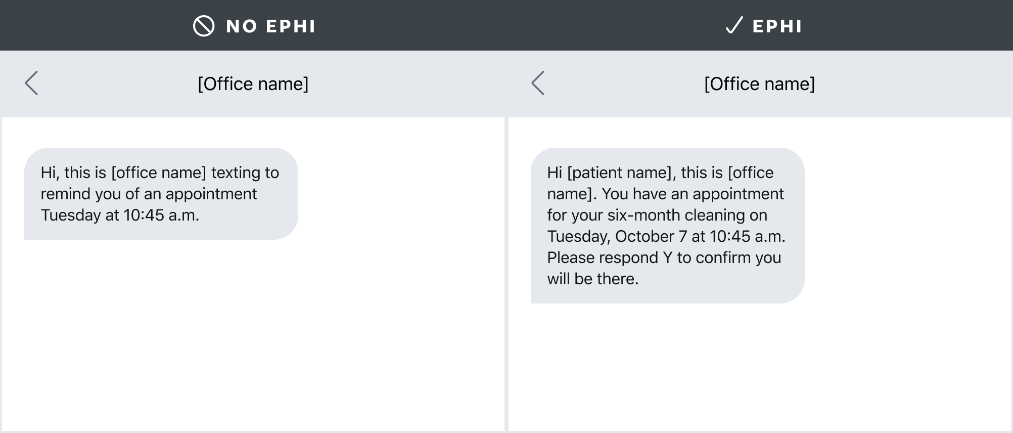 If a HIPAA-compliant platform is not being used, identifying information must be kept out of the correspondence. Consider the following example, wherein the dental office is sending a text message to a patient to remind him or her about a dental hygiene appointment scheduled for