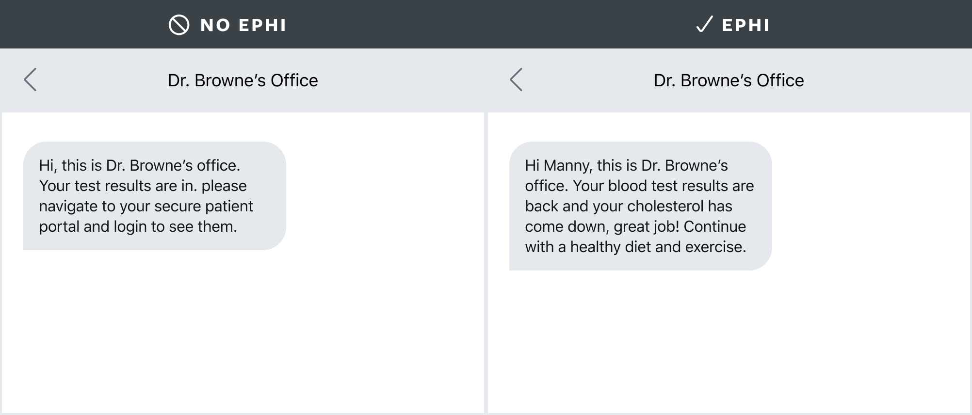 With a HIPPA-compliant platform, ePHI such as test results or follow-up care information could be included. With a non-HIPAA-compliant platform, the information would need to be more vague or patients would need to be directed to receive this information elsewhere, such as a secure patient portal (Figure 3).
