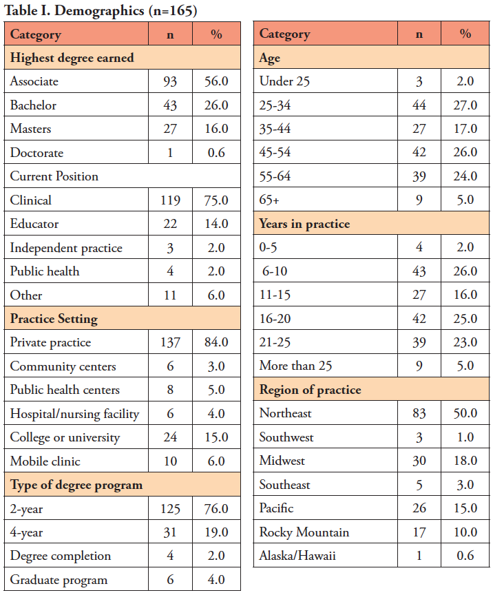 A total of 184 participants completed the survey. However, 19 respondents did not meet the inclusion criteria and were excluded from the data analysis for a sample of 165 licensed dental hygienists (n=165). A power analysis was conducted on the sample, and yielded a power of 90% (a=0.05). The majority of participants were employed in private practice settings (84.0%, n=137) and had graduated from a two-year program (76.0%, n=125). Half of the respondents came from the Northeastern US (n=83) and had between 16-25 years of clinical experience (n=81). Sample demographics are shown in Table I.