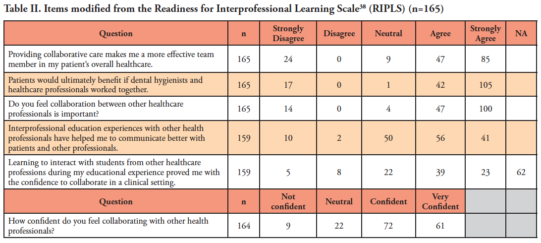 Findings from this study revealed that most dental hygienists surveyed were enthusiastic about collaborating with other health care professionals to provide comprehensive patient care. Data revealed more than half of the participants already collaborate with other health care professionals, regardless of a history of formal interprofessional education experiences. Most respondents indicated confidence in collaborating with other health care professionals, suggesting that dental hygienists recognize the immense value of collaborative teams of professionals and act based on those attitudes, independent of formal training.