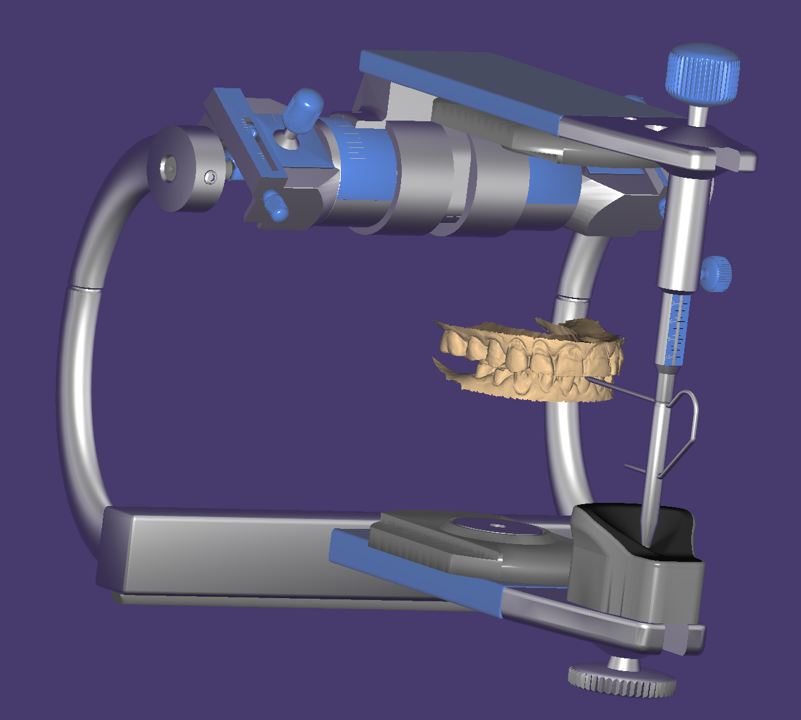 The digital articulator function was used to open the patient approximately to 1.5 mm (Figure 7), and digital wax-up was then created for ideal esthetic and functional restorations using a CAD software (Figure 8). This ideal wax-up was then printed using a 3D printer, and a putty matrix was created over the model for mock-up in the patient's mouth (Figure 9). All existing decay was then treated, and build-ups were performed on any needed teeth.