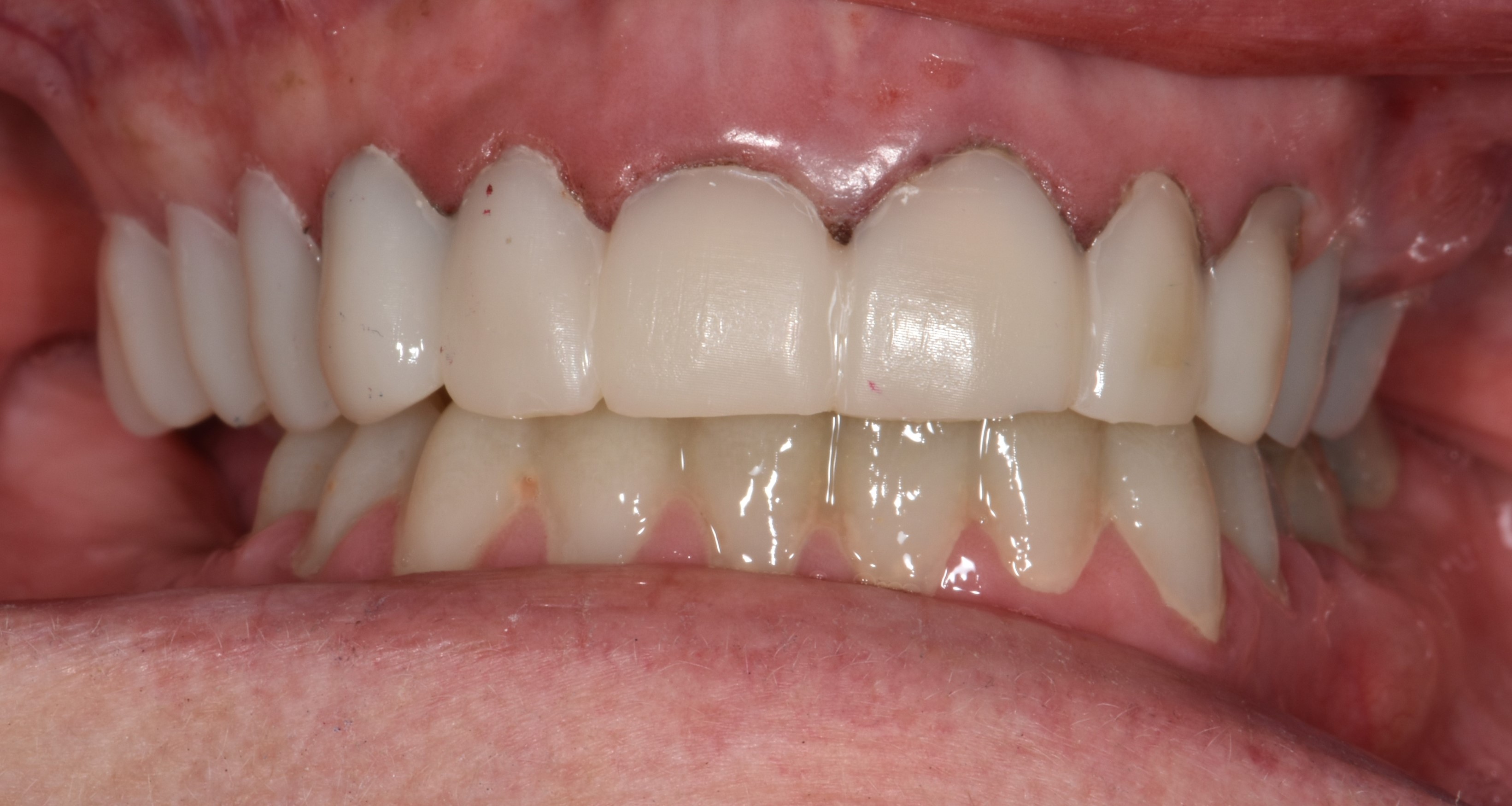 At a clinic treating patients in an underserved population, a 54-year-old female patient presented requesting extraction of all of her teeth and fabrication of dentures for her long-term restorations. The patient had a history of breast cancer, which had been treated with chemotherapy. She believed that full dentures would be an appropriate treatment option for her, owing to the poor state of her oral health and dentition and because she had limited financial resources and did not think that she could afford restoration of her teeth. The patient reported that she had experienced depression and alcohol abuse because of her cancer diagnosis, and that she had neglected her dental care during the course of her cancer treatment, resulting in generalized moderate-to-severe caries with moderate wear due to bruxism (Figure 1 through Figure 5). She also presented with significant staining of her remaining dentition due to the alcohol abuse.