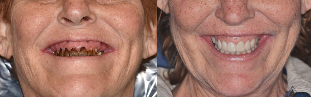 After clinical evaluation and treatment planning, it was determined that the state of the patient's dentition was not hopeless and that her teeth could be restored. The patient decided that she would like to try to preserve her natural teeth with a full-mouth crown and bridge rehabilitation, and to have any salvageable teeth treated with root canal therapy instead of extraction, if possible. After a thorough examination, it was determined that one tooth would need to be extracted (tooth