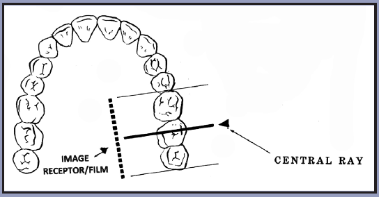 The beam's horizontal direction determines the degree of overlap among the tooth images at the interproximal spaces. When radiographing relatively aligned teeth, if the central beam is not perpendicular to the interproximal spaces, the teeth will overlap and the spaces between the contacts will close on the image. Imagine a flashlight beam approaching a picket fence at a perpendicular 90-degree angle. The spaces between the pickets will remain open in the shadow image unless the beam angle varies from perpendicular. The degree of overlapping will increase or decrease as the beam angle increases or decreases from perpendicular.