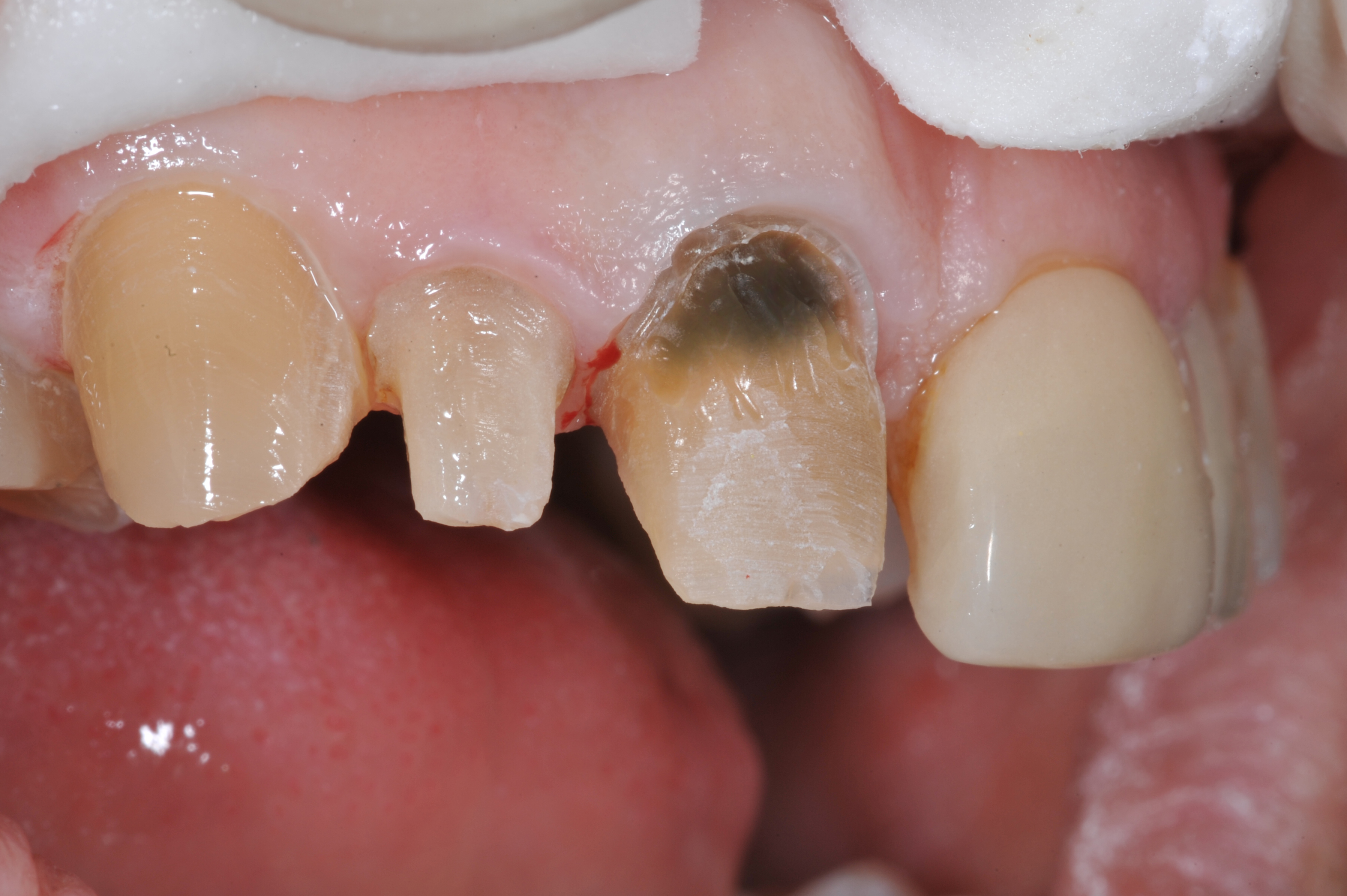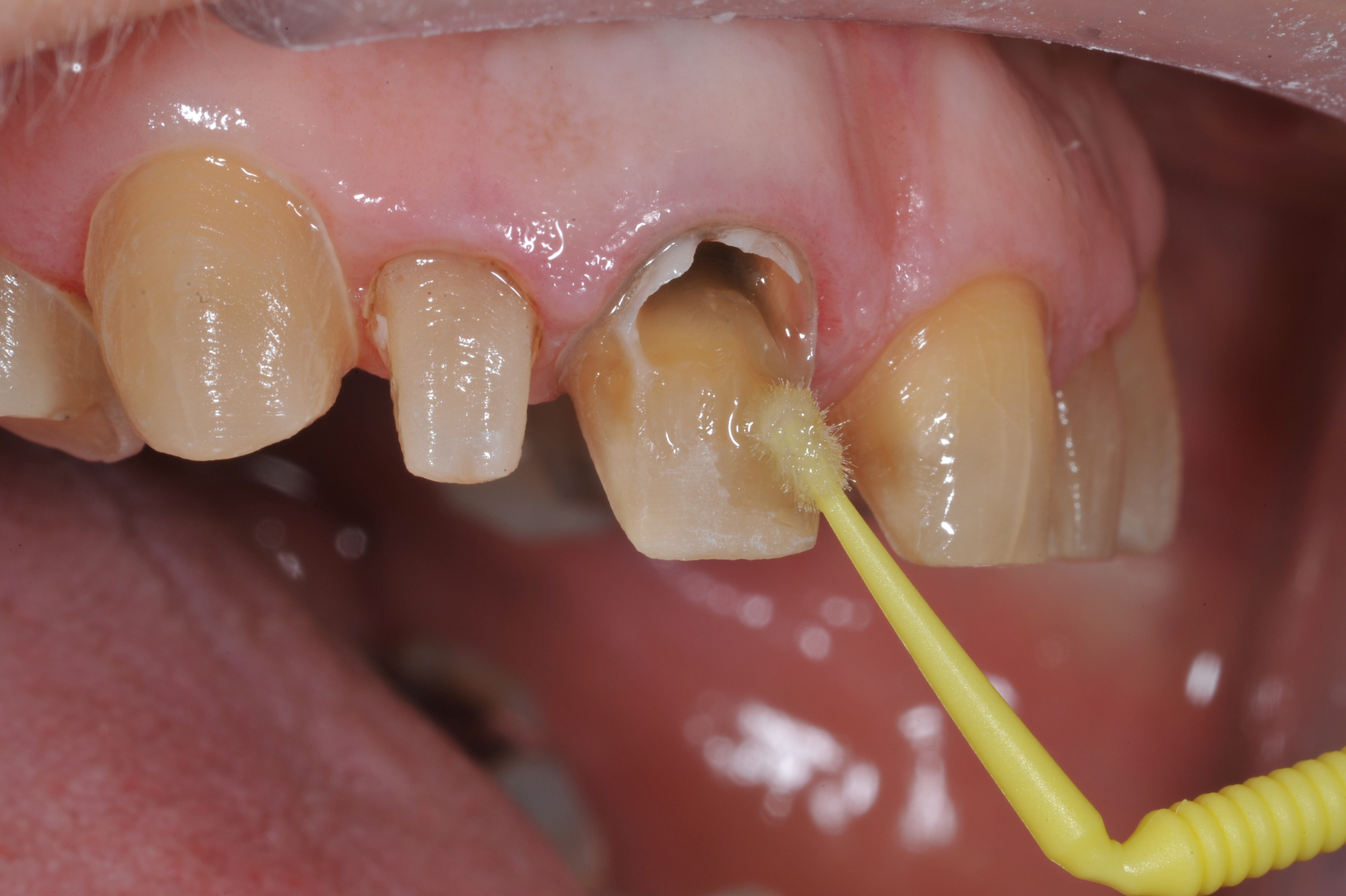There was significant darkness beneath the porcelain-fused-to-metal restoration on tooth No. 8 and options to lessen its influence on the final restorations were considered (Figure 4). As is often the case, removal of dentin only leads to intensification of the darkness, so here 1 to 2 mm was removed facially and "ditched" subgingivally. A universal dentin bonding agent (All-Bond Universal, Bisco) was applied and agitated to the surface in several layers and light cured (Figure 5).