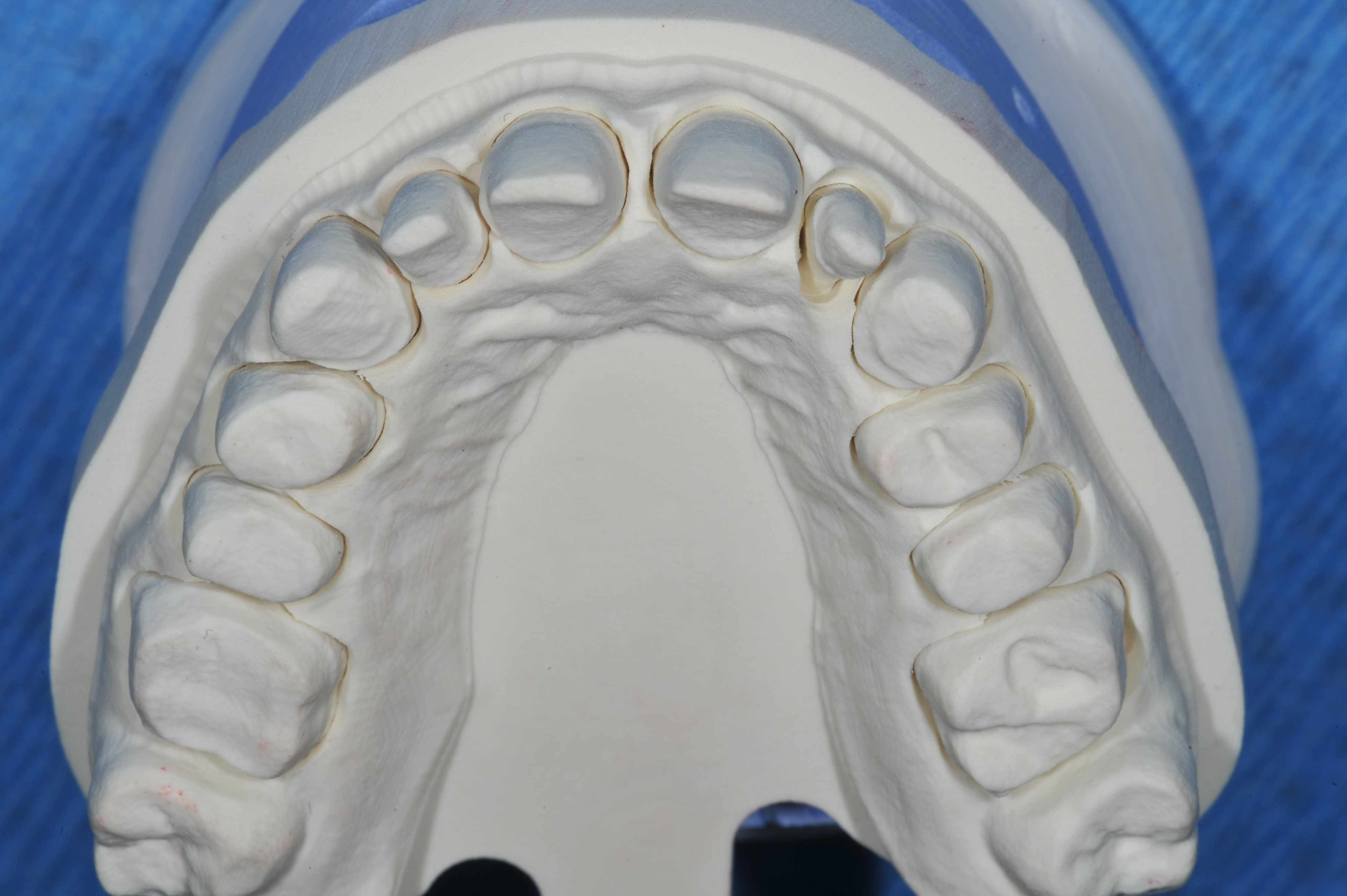 Impressions were taken with a poly vinyl siloxane (Panasil, Kettenbach) and sent to the laboratory with all photos, bite registrations, and dentofacial analyzer index (Kois Dentofacial Analyzer, Panodent). Temporaries were made for the central incisors, 2% chlorhexidine painted on teeth (Cavity Cleanser, Bisco) and placed with a temporary cement (Zone Free, Pentron). The instructions for the laboratory were for monolithic zirconia restorations Nos. 3 to 14, with particular attention to occlusion, opacity, value, and final shade.