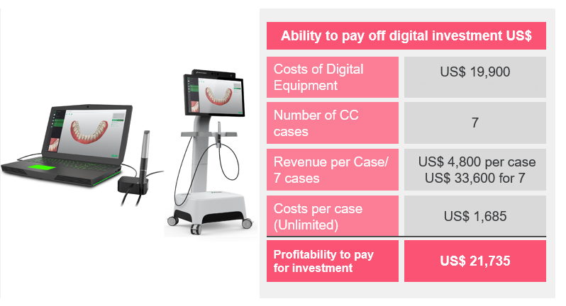 A fully integrated intraoral scanner can enable a dental practice to grow and differentiate while at the same time providing a fast "break even" on the investment. How the dental practitioner chooses which scanner to use in his or her practice has become much more complicated today, as the market has been flooded with numerous scanner options. It is beyond the scope of this article to discuss the extent of these options and technologies. However, it is important to note that in selecting a scanner, there are many factors to consider. In addition to cost considerations, the practitioner will need to assess the needs of the practice. It is necessary to determine whether the practice's needs are best served by a scanner that has an open or a closed platform, and to note what restrictions a particular scanner may have; this is especially important if the clinician wishes to use it over multiple interfaces and companies, as not all scanners allow this. Also, beyond the outlay costs, the additional costs that the practice may incur must also be considered. For example, some scanners require monthly maintenance fees, while others do not; some offer sterilizable scanner tips, whereas others charge an additional recurring cost for these tips. As with the purchase of any dental equipment, the purchase of an intraoral scanner represents a significant investment, and the clinician will need to research the various options carefully.
