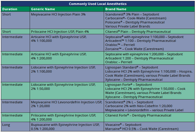 Table 1 summarizes some commonly used local anesthetics. Absorption of the pharmacologic agent is dependent on a number of factors, including whether the pH level of the tissue has dropped due to localized infection. Other factors include drug solubility, vascularity of the tissue at the injection site, and the impact of the agent on circulation. As such, duration is highly variable and specific for each drug. (Refer to the current Physician's Desk Reference - or "PDR" - for duration and potential side effects of specific products.)