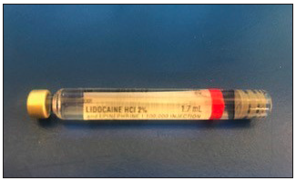 Local anesthetic solutions are supplied in glass cylinders called cartridges or carpules. One end of the cartridge has a rubber or silicone stopper (which is slightly indented from the edge of the glass) and the other end has an aluminum cap with a rubber diaphragm in the center. (Figure 9) The cartridge itself is covered with a plastic label that contains pertinent information: the name of the anesthetic solution and its concentration, the ratio of vasoconstrictor (if it contains one), the volume (1.7 ml), the lot number, the expiration date, and the manufacturer. The label on the cartridge should always be checked before it is used. It is imperative to note that the correct solution is being used, and whether or not it contains a vasoconstrictor. Also, the cartridge should not be used past the expiration date.