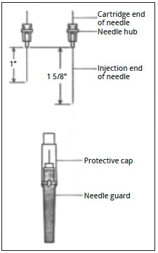 4. Break the safety seal on the needle cover and remove the clear plastic cover from the syringe end of the needle. If a needle is found to have a previously broken seal, it should be discarded in the sharps container, and a new one obtained. Do not remove the needle guard (the other plastic cover) from the injection end of the needle.