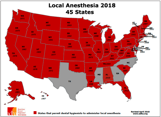 Dentists and dental therapists (where applicable) are licensed to administer anesthesia, and many states and the District of Columbia allow dental hygienists to administer local anesthesia under the supervision of a dentist (Figure 5). State educational requirements vary for accreditation or board certification in the administration of local anesthetics by dental hygienists. Since requirements change and are different from state to state, it is important to check with your state dental practice act for the most up-to-date information.