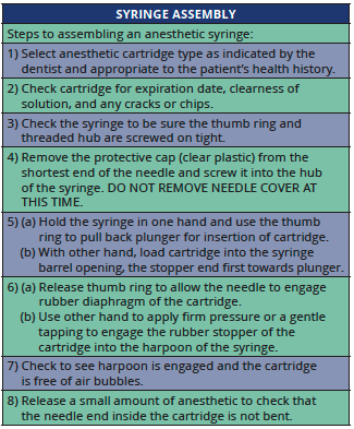 In order to properly assemble the syringe with the anesthetic cartridge and the needle, the assistant must be certain that they have assembled the correct items. Selection of the proper anesthetic solution is critical. The assistant should check the patient's record to determine the type of anesthesia to be used. The assistant must also know what area of the oral cavity will be anesthetized in order to determine the proper needle length and gauge. The dental provider should be consulted regarding both the type of anesthesia and the type of needle before the syringe is assembled.8 When the appropriate anesthetic cartridge has been chosen, it should be inspected, as described in the previous section on anesthetic cartridges. The assistant should also double-check that they have chosen the correct type of anesthesia. The syringe can then be removed from its protective wrapping, and inspected to be sure it is safe and ready for use.