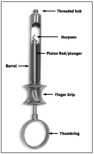 Anesthetic syringes vary in design and can be either stainless steel, which are autoclavable; or plastic, which are autoclavable or disposable. The most common type of syringe used in dentistry is the aspirating syringe. The parts of the syringe are shown in Figure 7, and their functions are discussed in Table 3. The aspirating syringe is recommended by the ADA.7 It protects the patient by allowing the clinician to check for proper placement of the needle before actually injecting the anesthetic solution. Anesthetic solutions must not be injected into the bloodstream because they can be toxic. The aspirating syringe prevents the injection of the solution into a blood vessel. The clinician will place the needle in the tissue and then apply negative (back) pressure on the thumb ring. If the needle is placed in a blood vessel, blood will be aspirated (or drawn back into) the cartridge. The clinician then knows that they must withdraw the needle and reposition it so that the solution will not be injected into a blood vessel.