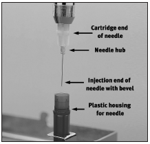 Precautions should be taken when disassembling the syringe; always wear heavy or neoprene gloves when cleaning instruments prior to sterilization processing. Disassemble the syringe with the needle recapped by pulling back on the plunger, removing the cartridge, and unscrewing the needle from the syringe hub. Do not bend or break needles during disposal. Dispose of the needle and cover in a sharps container. When a sharps container is full to its "fill" line, dispose of it according to state or local regulations for biohazardous waste. Dental needles are intended for single use only; they should never be reused.