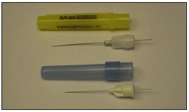 Anesthetic needles are also available in varying diameters, or gauges. This refers to the thickness of the needle. There are three gauges commonly used in dentistry: 25, 27, and 30. The larger the gauge number, the smaller the diameter of the needle (the thinner the needle). For example, a 30 gauge needle is thinner than a 25 gauge needle. For infiltration and field block anesthesia, a smaller gauge needle (30) is often used, while a higher gauge needle (27, or 25) is used for nerve block anesthesia. Generally, when using a longer needle, a higher gauge is used because it allows the needle to be stronger. Figure 3 illustrates a disposable needle.