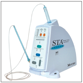 Although Cook invented the modern dental syringe more than one hundred years ago, it is only recently that anesthetic delivery systems have seen major innovations. One new device, the STA or Single Tooth Application Wand™ (Figure 17), uses a microprocessor to control the delivery of a small amount of anesthesia ahead of the needle, thus ensuring a steady flow of anesthetic through the needle into the tissue. According to the manufacturer, this delivery method reduces the amount of pain that patients experience and increases their comfort. In addition, delivering anesthesia using this device may help patients avoid numbness of the tongue, lips, face, and other muscles.