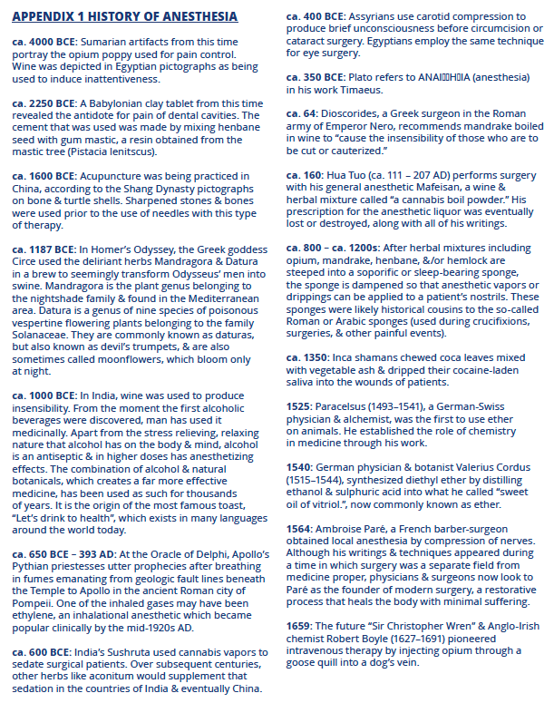 Various plants, herbs, and drugs were used in different combinations throughout time. Efforts to minimize pain were not confined to the inhalation drugs in the early days of anesthesia. Application of continual pressure on blood vessels, local applications of ice water, ethyl chloride spray, and sometimes a crack on the head with a mallet were among the methods used to reduce pain during a procedure. Prior to the introduction of ether by Morton in 1842 and nitrous oxide by Wells in 1844, little could be done to reduce the discomfort associated with the performance of dental and other oral procedures. These chemicals were used mostly for analgesia or anesthesia during extractions and other surgical procedures, and most patients did not experience anesthesia for other types of routine dental procedures until after the introduction of conduction anesthesia in the late 1800s.1 The timeline in Appendix 1 shows creativity as well as experimentation until these techniques were perfected with elapsed time.