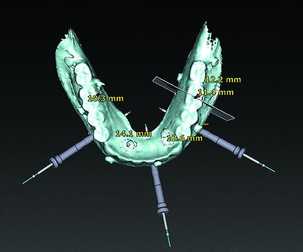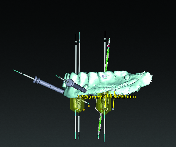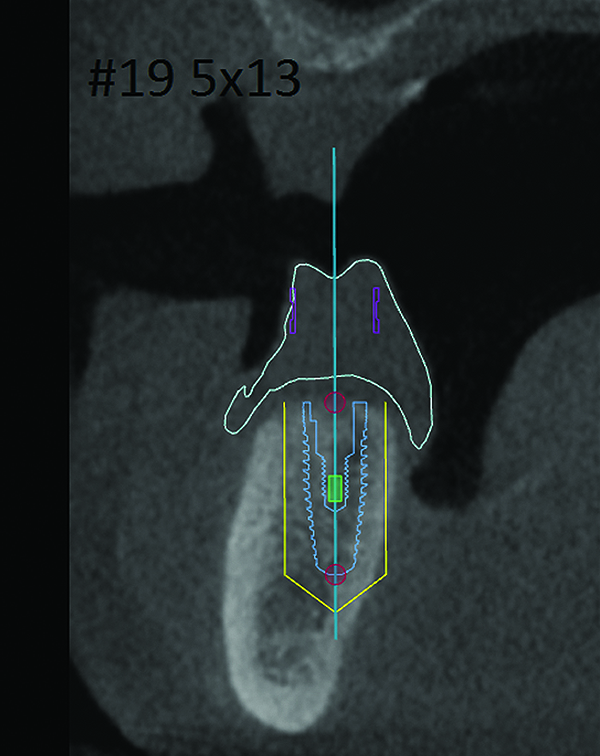 3D radiographic files (CT, CBCT) are stored digitally using a standardized digital imaging and communication in medicine (DICOM) format. In combination with a radiographic guide fabricated from a diagnostic wax-up, CBCT can be used to plan implant location and angulation based on prosthetically driven parameters and local bone/tissue constraints (Figure 8 through Figure 11). Currently, there are two different protocols to incorporate the radiographic guide in 3D scans and to perform computer guided surgery. The first is the double scan protocol, in which the patient wearing the radiographic guide and the radiographic guide alone are scanned separately. Fiduciary markers incorporated in the radiographic guide allow for matching of the two scans. This protocol allows for digitization of the surgical guide with great accuracy, irrespective of errors introduced by patient scans.18 Specialized software can be used to create a surgical guide (Figure 12).