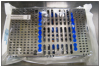There are two basic methods of mechanical cleaning used in dentistry. The first, ultrasonic cleaners, consist of a chamber into which the instruments are place. (Figure 1) A solution of water and detergent (formulated specifically for use with the ultrasonic cleaner and dental instruments) clean instruments with the assistance of sonic waves. The sonic waves produce cavitations, the mechanical means of cleaning instruments. A basket holds the instruments slightly elevated from the floor of the ultrasonic chamber, increasing the efficacy of the cleaning method. During operation, cover the ultrasonic machine to prevent the aerosolization of the fluids and potential contamination of the surrounding surfaces.