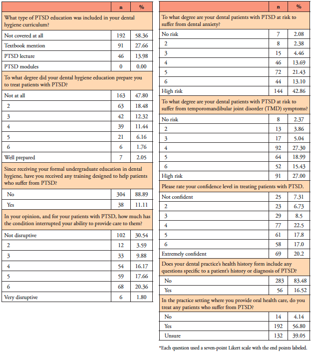 Most participants (58.2%, n=192) reported that they had not received any curricular content related to PTSD from lectures or textbooks during their dental hygiene education. In addition, nearly half (47.8%, n=163) reported they had not received any preparation for treating patients with PTSD during their undergraduate education. A small number of participants (11.1%, n=38) indicated having completed continuing education or training regarding treatment of patients with PTSD since completing their dental hygiene education program (Table II).