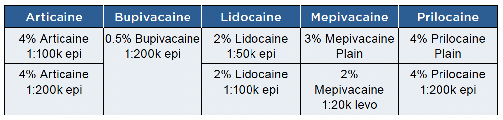 All five North American injectable local anesthetic agents in dental cartridges are amides. Compared to pre-amide injectable ester drugs (which are metabolized in the blood by esterases) amides are metabolized more slowly, primarily in the liver by the cytochrome (CYP450) or P450 isoenzyme system (see Table 1: Common Dental Amide Local Anesthetic Formulations).