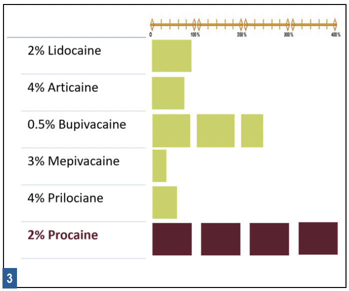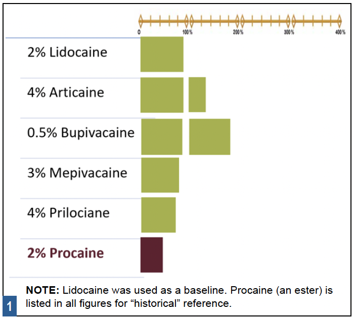 Relative potency refers to the amount of a particular drug required to produce the same therapeutic effect as other drugs, in this case other injectable local anesthetics. More potent LA drugs are effective at lower dosages. This discussion hinges on whether the comparison is between actual milligrams of one drug and milligrams of another drug, or between formulations of drugs available by cartridge. Comparing lidocaine and articaine is a common example of comparing potency. Each milligram of lidocaine is more potent than each milligram of articaine; however, each cartridge of 2% lidocaine is less potent than each cartridge of 4% articaine, which has been reported in many applications (for example pulpitis, mandibular infiltration, and palatal anesthesia resulting from buccal infiltration).1,2,3