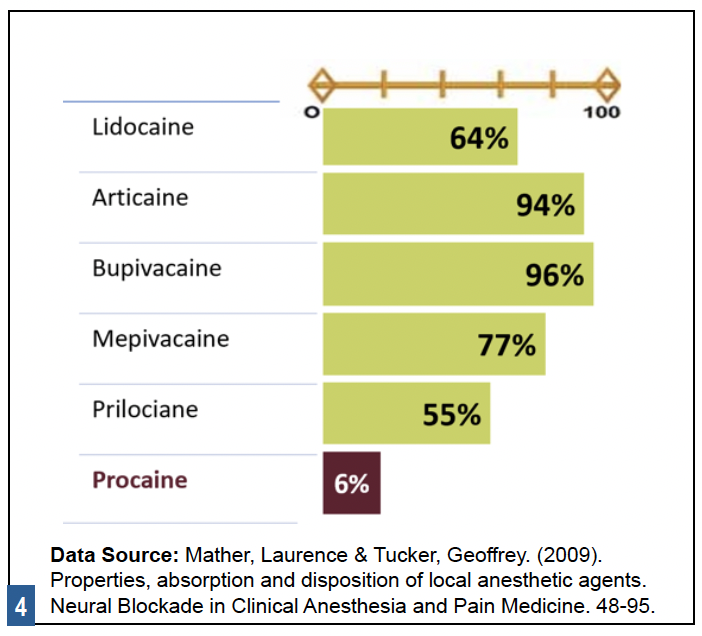 Bupivacaine and articaine, for example, have strong binding strengths, while prilocaine and procaine have significantly weaker binding strengths (see Figure 4: Plasma Protein Binding Strength of Dental LA Drugs).