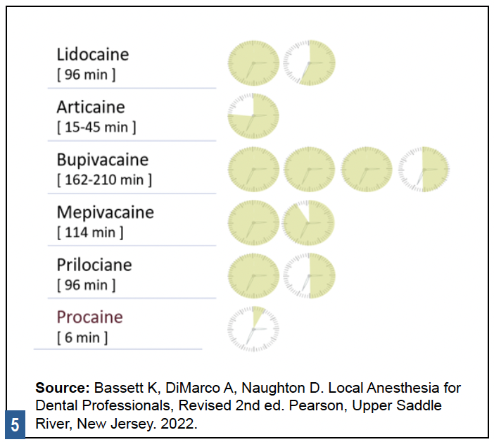 Elimination half-life is useful when approaching MRDs to determine appropriate intervals for additional administrations of LA drugs or when considering scheduling multiple appointments on the same day. Understanding t1/2 can be especially valuable when planning procedures with patients who are nursing. The drug with the shortest elimination half-life is articaine. Product Instructions for Use state: "When using [articaine], nursing mothers may choose to pump and discard breast milk for approximately 4 hours (based on plasma half-life) following an injection of [articaine] (to minimize infant ingestion) and then resume breastfeeding."8