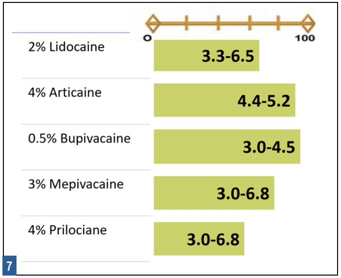 Every time LA drugs are administered, innate (natural) carbonate buffering occurs, increasing the pH of the tissues and quickly counteracting the effects of the acidity of LA drugs (see Figure 7: pH of Dental LA Drugs). This type of buffering is responsible for successful LA procedures even with a range of pH among drugs. While onset times are reduced, buffering with sodium bicarbonate solutions just prior to injection provides significantly greater benefits.