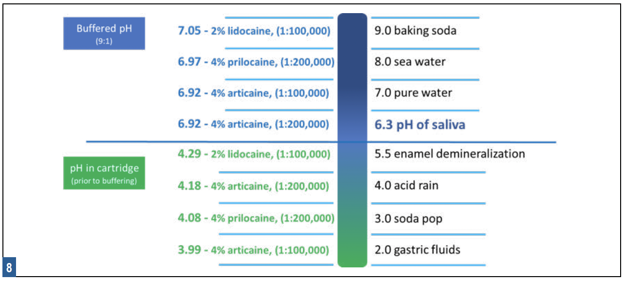 Not only does efficacy increase significantly with buffering, but depositing less solution is recommended compared to non-buffered depositions for the same technique.16 Sodium bicarbonate buffering solutions, by virtue of being diluted with buffering agents (LA drug mixed with specific volumes of buffering solutions), are less concentrated. In effect, buffered LA drugs are slightly less concentrated and have been demonstrated to be more effective than their non-buffered counterparts even when somewhat less concentrated. A recent systematic review of the effectiveness of buffered drugs in pulpitis of the mandible pointed to a 2.29 times overall greater efficacy compared to non-buffered, slightly more concentrated counterparts.15See some examples of buffered versus non-buffered drug pH in Figure 8.