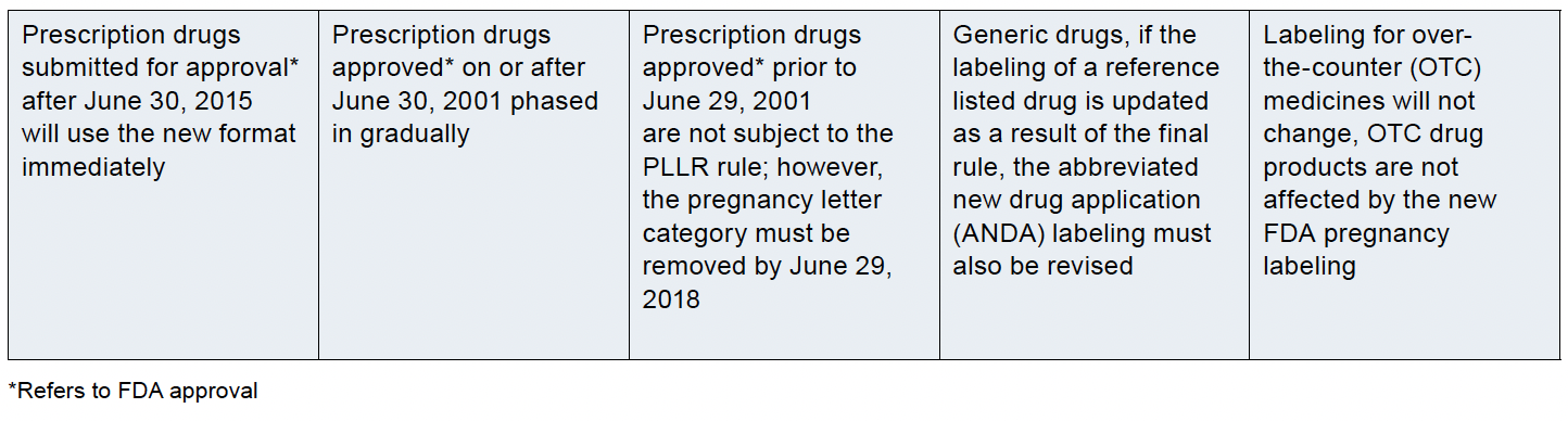 While the new Pregnancy and Lactation Labeling Final Rule (PLLR) went into effect on June 30, 2015, the implementation timeline of changes in product directions for use, including drug labels and package inserts, is variable (see Table 2). The A, B, C, D, and X risk categories, in use since 1979, are now replaced with narrative presentations of information related to use of a drug during pregnancy and lactation including: Risk Summary, Clinical Considerations for Use, and Supporting Data. A lactation subsection provides information about using the drug while breastfeeding, including, the amount of drug in breast milk and potential effects on the breastfed infant, and a subsection on females and males of reproductive potential with information about the need for (1) pregnancy testing, (2) contraception, and (3) infertility.